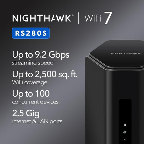 NETGEAR Nighthawk Tri-Band WiFi 7 Router (RS280S) - Security Features, BE9200 Wireless Speed (up to 9.2 Gbps) - Covers up to 2,500 sq. ft. - 2.5 Gig Internet Port – 1-Year Armor & Free Expert Help