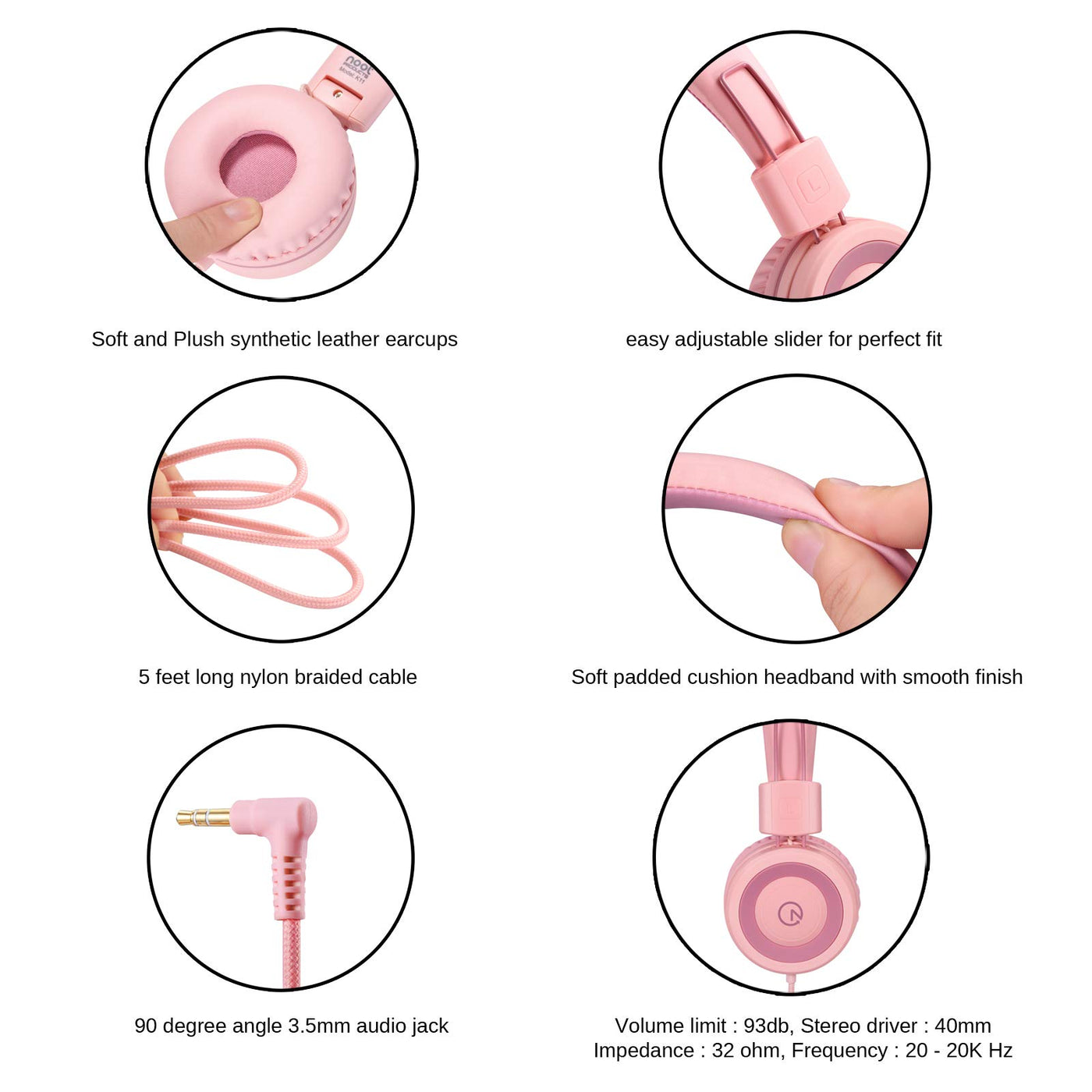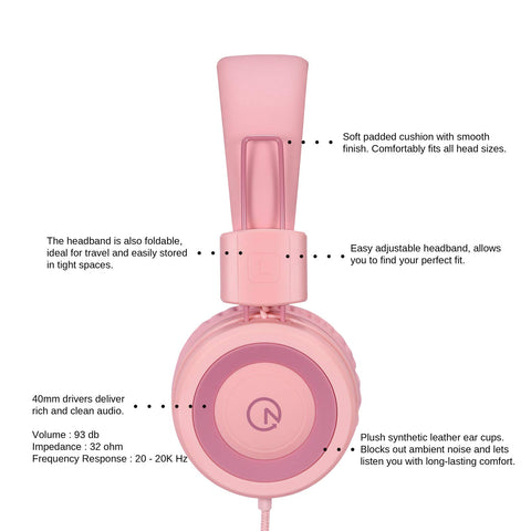 noot products Kids Headphones K11 Foldable Stereo Tangle-Free 5ft Long Cord 3.5mm Jack Plug in Wired On-Ear Headset for iPad/Girls/Boys/School/Laptop/Travel/Plane/Tablet-Soft Pink