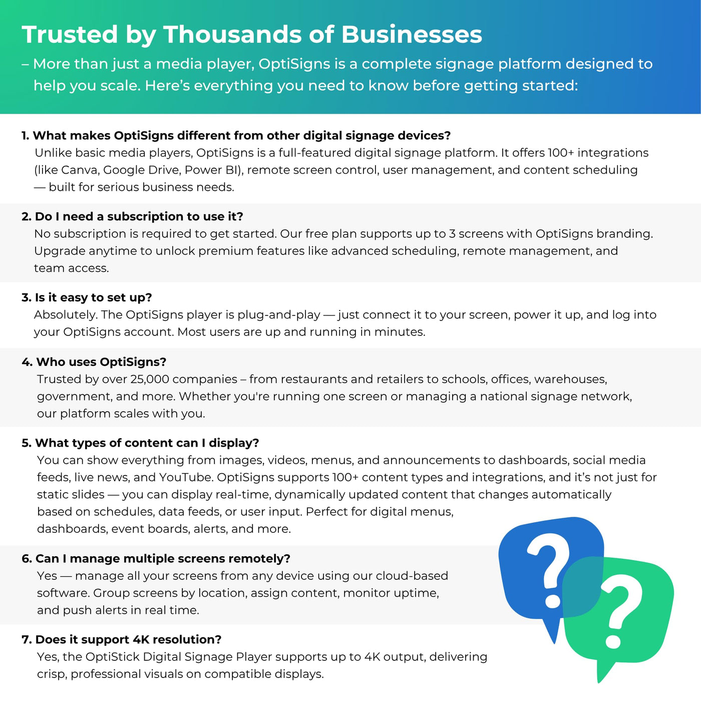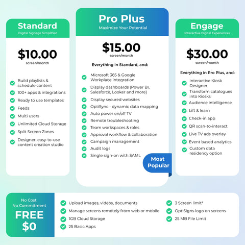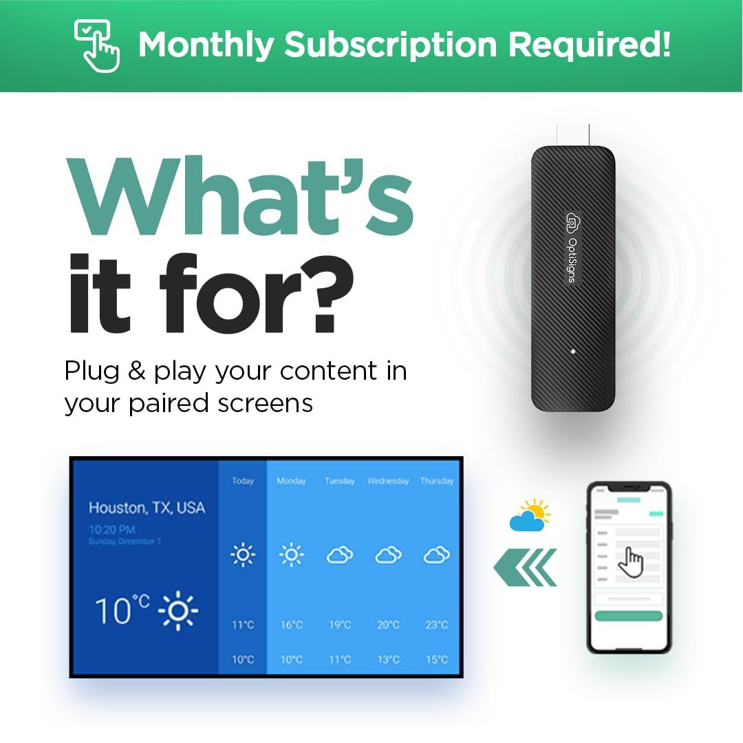 - OptiSigns subscription needed. Free plan available for up to 3 screens with OptiSigns branding.