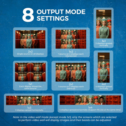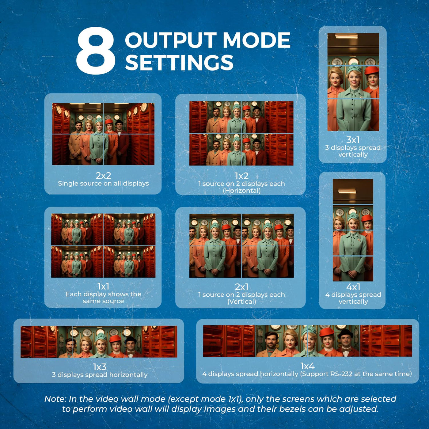 - Multiple Display Modes - 2x2, 1x2, 2x1, 1x3, 3x1, 1x4, 4x1 (1080i each Display) and 1x4 Splitter Mode (Display the same source on all 4 TVs @ 4K Each Display) Bezel Adjustment and EDID Management