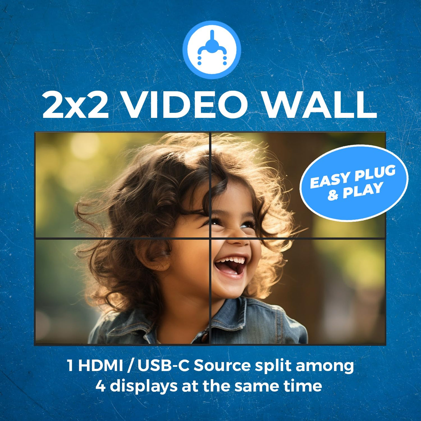 - Versatile Input Options: Connects one HDMI or USB-C source (e.g., Blu-ray Player, PC, Laptop, Media Player, Gaming Console) and displays content across four TV screens simultaneously.