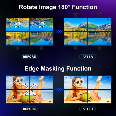- 【180° Image Rotation & Bezel Adjustment】Image Rotation: Each screen’s image can be rotated by 180° to adjust the border orientation with the thinnest edges of each screen and reduce the screen splicing gap. Bezel Adjustment: Press H-Bezel/V-Bezel buttons to add or cut output picture edges with 8-pixel each. This ensures your pictures remain free from deformation and stretching, appearing more natural and realistic