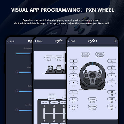 - ✅【Visual APP Programming】:Experience top-notch visual app programming with our racing wheels! Find the "PXN Wheel" app on Google/Apple App Store for easy installation.including high and low sensitivity adjustments. Save multiple game key settings hassle-free, ensuring seamless gaming every time. high-quality construction with non-slip ABS matte material and real dual vibration motors. Secure them firmly with 5 suction cups and 2 C-shaped fixing brackets for maximum comfort and gaming pleasure.