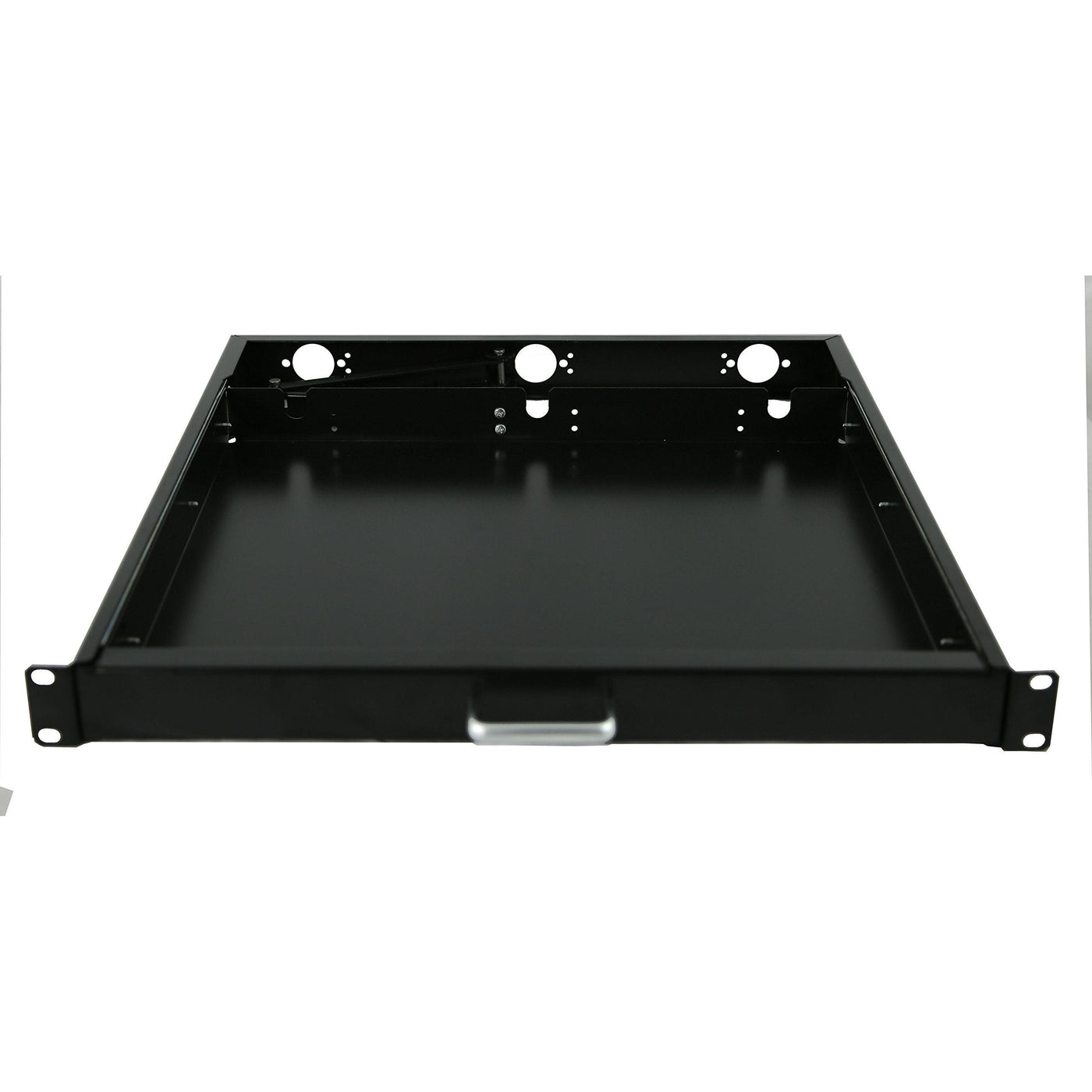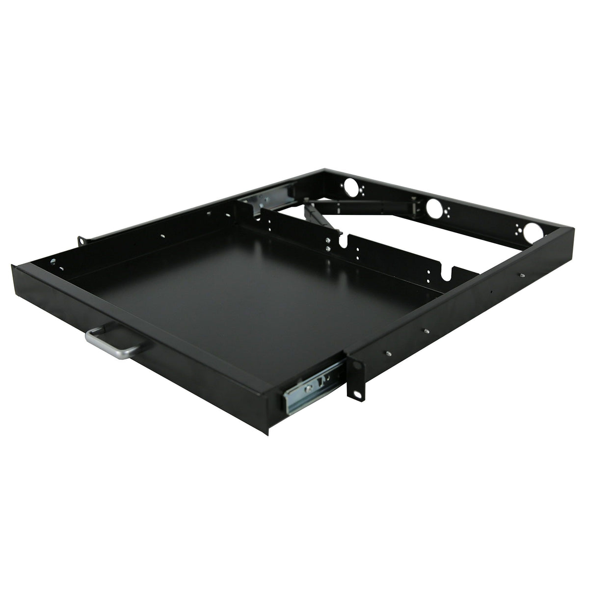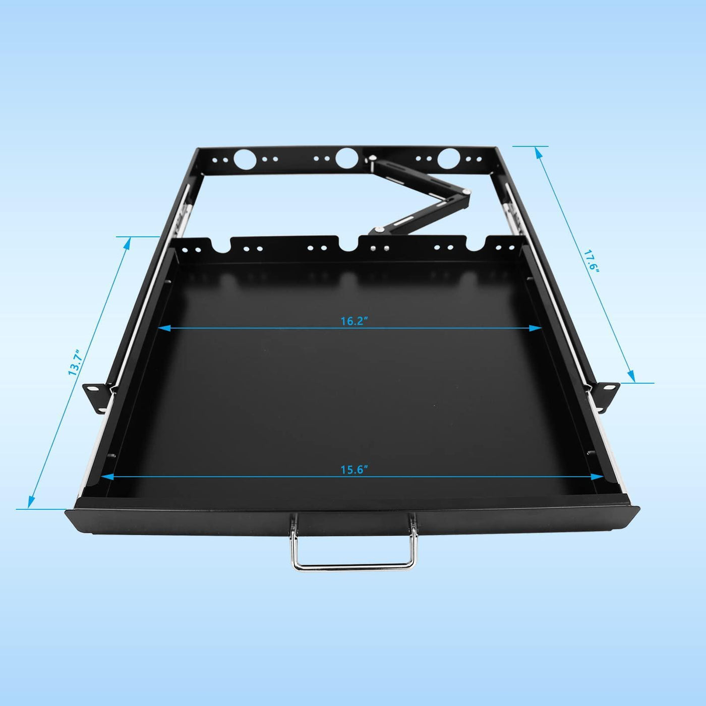 Details: Raising Electronics Rack Mount Keyboard Tray - Solid, Versatile and Premium Quality, organize and secure your Rack Mount Equipment. This premium quality 1U rack mount keyboard is designed to fit different installation depth of racks and cabinets. It is easy to mount on a 19" standard rack or cabinet. The shelf is made of cold rolled steel to provide you with a maximum load of 20LB. With the heavy duty materiel, it provides you with exceptional stability. Rack self has 14” deep and extends 9”. Back cable holes are very convenient to organize your cables. Mounting screw kit is included.