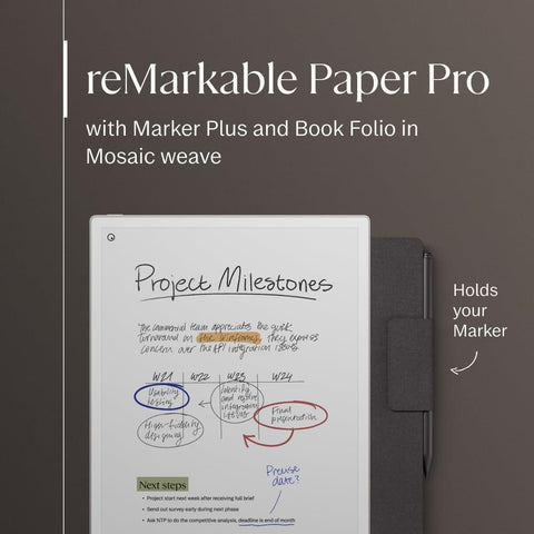 - WHAT’S IN THE BOX – You’ll find reMarkable Paper Pro, a digital notebook for unprecedented paper-like writing with 11.8” Canvas Color display; Marker Plus, the reMarkable pen with built-in eraser; 6 spare Marker tips; Book Folio, a stylish protective cover in premium Mosaic weave; and USB-C cable.