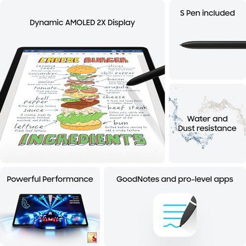 Details: Galaxy AI is here. Search like never before¹, let transcript assist² take the notes for you, format your notes into a clear summary³, and effortlessly edit your photos⁴ - all from your tablet, all with AI. Tab into your potential with Galaxy Tab S9 and bring balance to your active life. Why not make the everyday a little more extraordinary? Galaxy Tab S9 pushes the boundaries of what you expect from of a tablet. Supported by a mighty processor and a powerful battery, you can seamlessly switch between accomplishing priorities and enjoying your favorite pastimes.