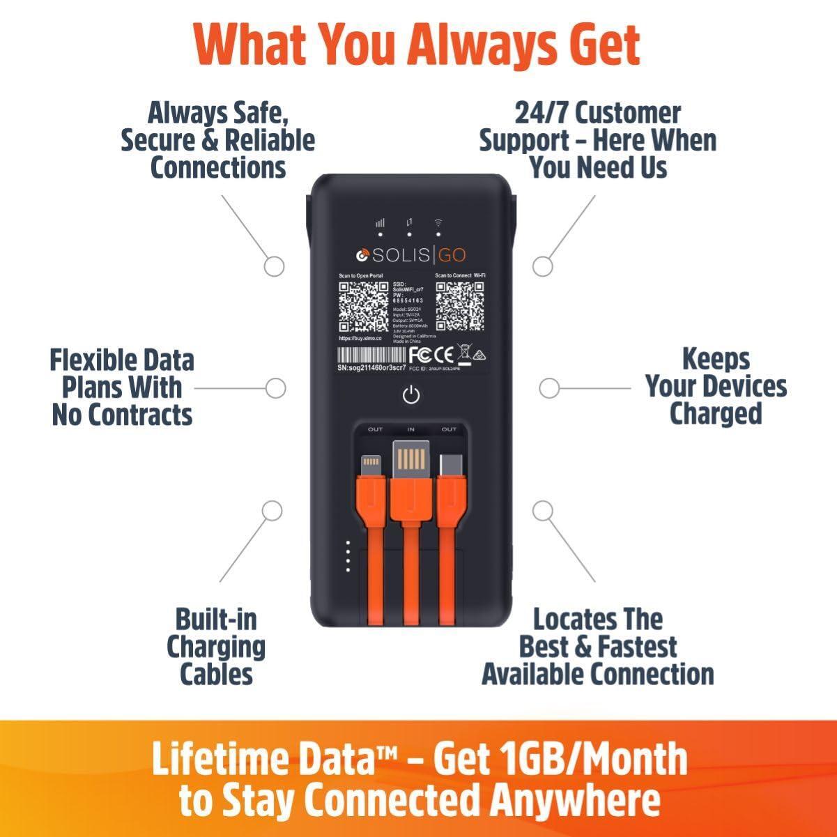 - Easy to Use: Simply download the Solis app and register your device; start using your Lifetime Data plan or add an additional WiFi option to safely and privately connect to available signals