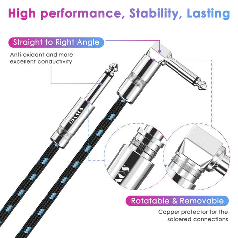 Sovvid 10FT Instrument Cable - Electric Guitar & Bass Cable with Right Angle 1/4 Inch Connector - Black & Bluetest