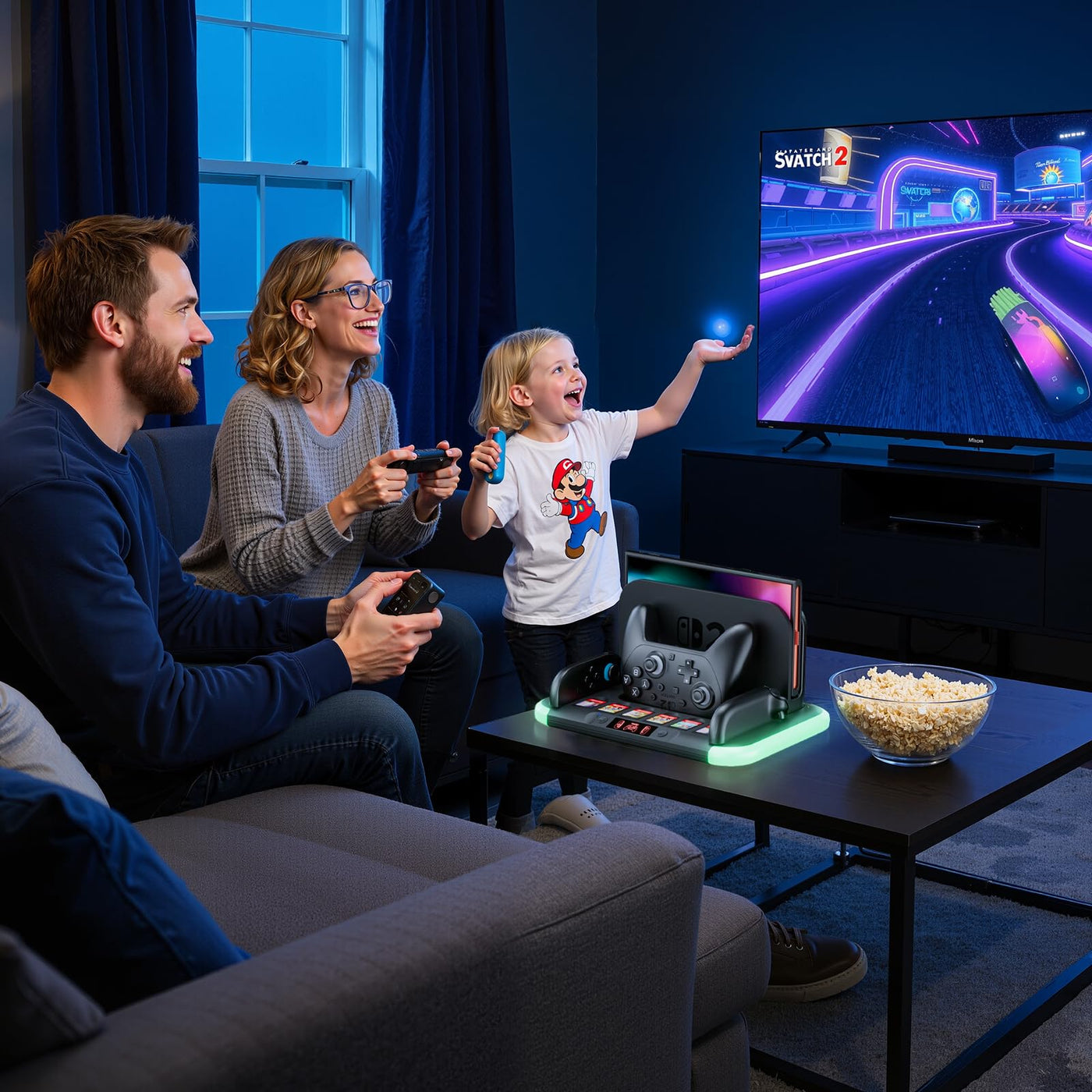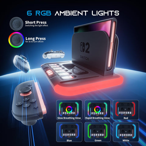 - 【6 RGB Ambient Light Modes】Personalize your Switch 2 gaming station with 6 modes RGB color changing light: slow breathing glow, rapid breathing glow, red glow, green glow, blue glow and white glow. Transform your nintendo switch 2 joycon charging dock into a stylish centerpiece. Just enjoy a relaxing and eye-comfortable charging experience with our soft ambient glow, The nintendo switch 2 stand also lets you easily find your controllers in the dark for ultimate convenience during late-night gaming sessions.