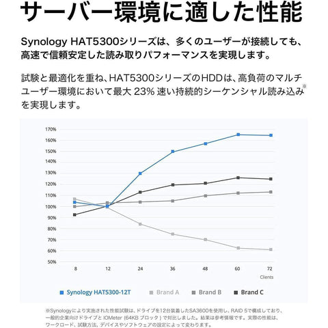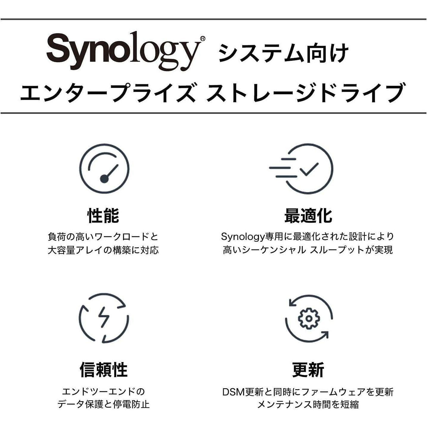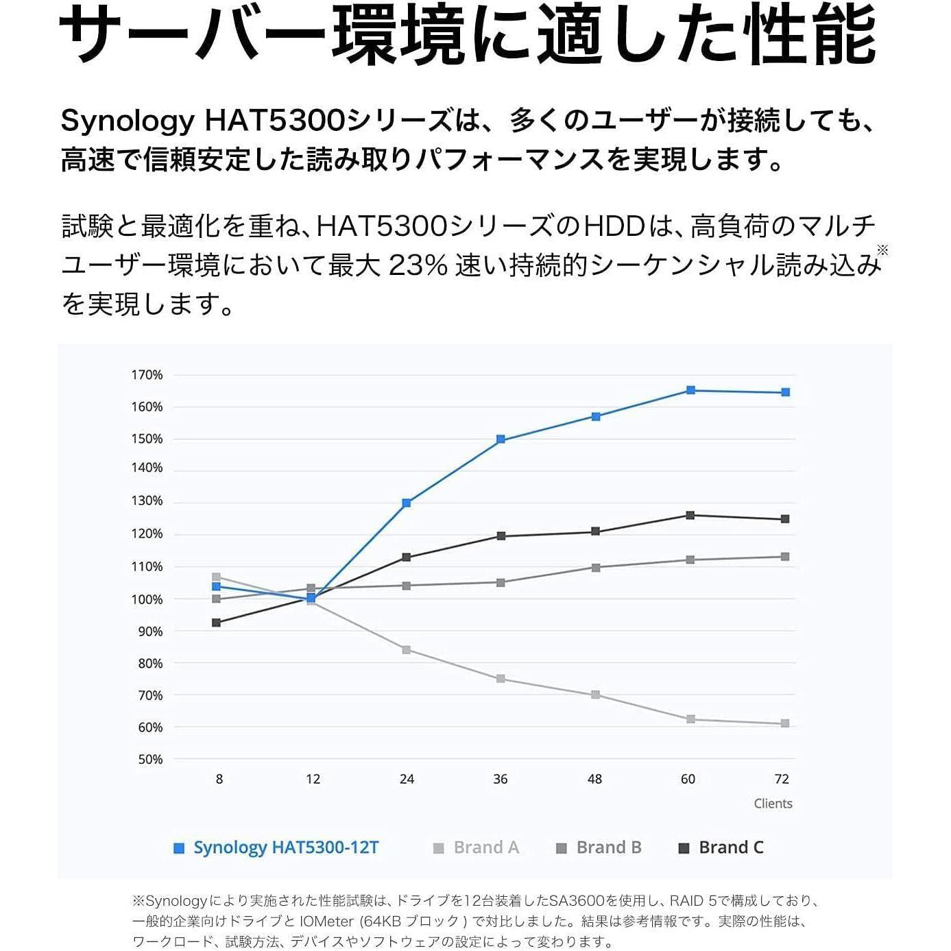 Details: Built for Demanding Workloads and HighCapacity ArraysSynology HAT5300 series is designed to tackle demanding, high-volume workloads. Optimized specifically for Synology storage solutions, its design enables high sequential throughput, maximizing the number of concurrent clients the system can sustain. HAT5300 series drives are engineered for maximum dependability, passing over 500,000 hours of validation, and are backed by Synology's 5-year limited warranty.Scale-up Confidently Synology HAT5300 series drives are engineered to provide fast and dependable performance, even for a large number of clients. Firmware and software collaborate to ensure maximum performance, delivering over 23% higher sequential read performance than similar capacity drives.1 HAT5300 series provides outstanding performance for large-scale video surveillance, multimedia post-production, and enterprise file server environmentsMaximum Endurance and Reliability Designed with our expertise in storage systems, HAT5300 series drives are backed by an up to 2.5 million hour MTTF rating, workload support of 550 TB per year, and persistent write cache technology. Over 500,000 hours of compatibility and stress testing ensure that the HAT5300 can continuously operate even under extreme workloads with our NAS and IP SAN lineup. Combined with data protection solutions running on Synology systems, you can confidently depend on your data 24/7 using HAT5300 series drives.Simplified Maintenance DSM updates will ensure that compatible Synology drives will be updated together with the operating system. This reduces the number of maintenance sessions IT teams need to schedule while also increasing the entire system's service availability. Simplify IT infrastructure planning requirements by getting support for the entire system from Synology.Highlights | Enterprise Reliability and DurabilityFor demanding 24/7 environments, rated for up to 2.5 million hours MTTF and up to 550 TB per year workloadsPersistent Write Cache Technology Minimizes the chance of data corruption in the event of sudden power lossBetter Together Firmware and DiskStation Manager (DSM) optimizations improve multi-client seq. read performance by up to 23%One-stop Update Get automatic firmware updates together through DSM updates, reducing the need for additional maintenance sessionsFor Synology, by Synology Stringent validation and up to 500,000 hours of tests ensures maximum reliability in Synology systems