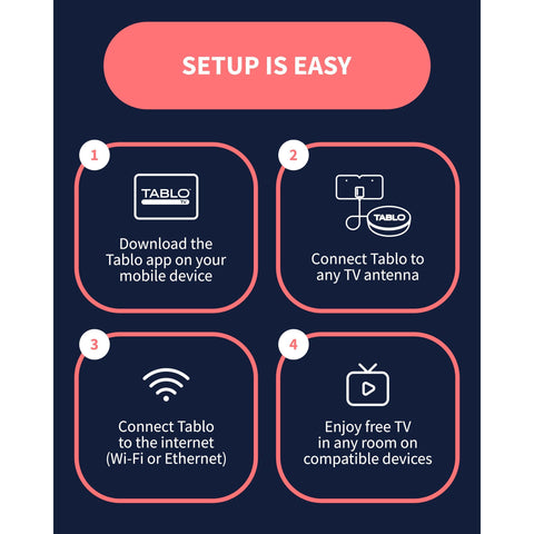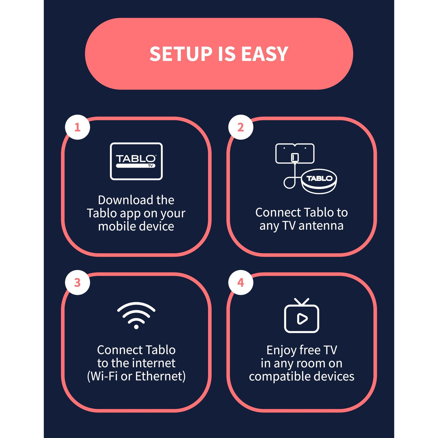 - EASY SETUP: Connect the Tablo DVR to ANY TV antenna (TV antenna sold separately); connect it to your home network via Wi-Fi or using the included Ethernet cable; download the Tablo app on your smartphone or tablet and follow the setup instructions(3). Scan the QR code on the included Quick Start Guide (Installation Manual) that will guide you through the entire product setup.