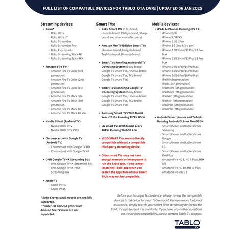 - WHOLE-HOME ACCESS: 1 DVR pairs with any TV antenna to let you watch TV on multiple compatible devices at once, including smartphones, tablets, as well as smart TVs & streaming players from Roku, Amazon Fire TV, Android TV, Chromecast w/ Google TV, Apple TV, Samsung TV, LG TV. For a full list of all compatible devices, view the product carousel image or download the User Guide (PDF) from Product guides and documents section. Tablo is not compatible with non-smart TVs, specific TV models and computers (PCs). Please check compatibility before making the purchase.