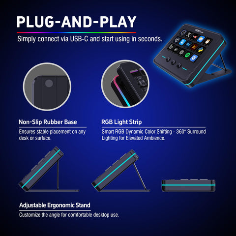 - 18 Programmable Keys Macro Keypad - The heart of the Streaming Deck lies in its 18 customized macro keys (15 visual LCD & 3 button). These keys offer unparalleled flexibility, allowing you to assign individual or a series of actions to streamline your workflow. Whether it's executing game combos, launching apps, or controlling media, the possibilities are endless. You can even personalize each LCD key with different images and animations (JPG, PNG, GIF) for enhanced recognition and memorization