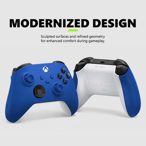 Details: "Experience the modernized design of the Xbox Wireless Controller in Shock Blue, featuring sculpted surfaces and refined geometry for enhanced comfort during gameplay with battery usage up to 40 hours. Stay on target with a hybrid D-pad and textured grip on the triggers, bumpers, and back-case. Seamlessly capture and share content such as screenshots, recordings, and more with the Share button. Connect using the USB-C port for direct plug and play to console and PC. Support for AA batteries is included on the rear. Plug in any compatible headset with the 3.5mm audio jack. Use the Xbox Accessories app to remap buttons and create custom controller profiles for your favorite games. Quickly pair with, play on, and switch between devices. *IMPORTANT INFO: Compatible with select devices and operating system versions; learn more at xbox.com/controller-compatibility. Battery life varies significantly with headsets, additional accessories, usage, and other factors. Testing conducted by Microsoft using standard AA batteries in preproduction units. Button mapping available via Xbox Accessories app for Xbox Series X|S, Xbox One, and Windows 10/11; app for Windows 10/11 requires compatible USB-C cable (sold separately)."
