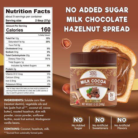 ChocZero Milk Chocolate Hazelnut Spread - Keto Friendly, No Sugar Added, Best Low Carb Dessert, Perfect Topping for Almond Flour Pancakes, Naturally Sweetened with Monk Fruit (1 jar, 12 oz) Sale