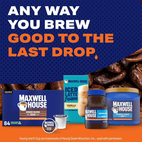 Details: Take a break with the coffee that practically invented breaks. The day's been a whirlwind and it's far from over. But here's the thing — you're not stressing it. Because you've got it all figured out. You're gonna brew the medium roast made for kicking back and enjoying the aroma. Maxwell House House Blend Medium Roast K-Cup Coffee Pods. Just sit back and savor every sip from your steaming cup full of strong, full-bodied Maxwell House flavor. Reset with that consistently delicious taste that hits the spot from the very first sip to the very last drop. And when that cup's empty and you're finally fueled up, you can squint your eyes, gather your gear and roll up your sleeves. Now you're ready to tackle anything, and there’s plenty of coffee pods ready for you in your 84 count box of Maxwell House House Blend Medium Roast K-Cup Coffee Pods. Let's show 'em what you're made of. Maxwell House. To Your Max.