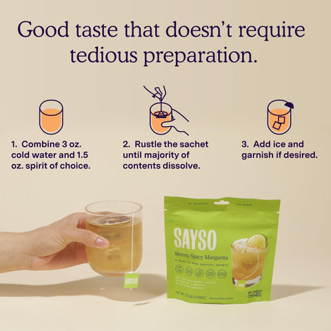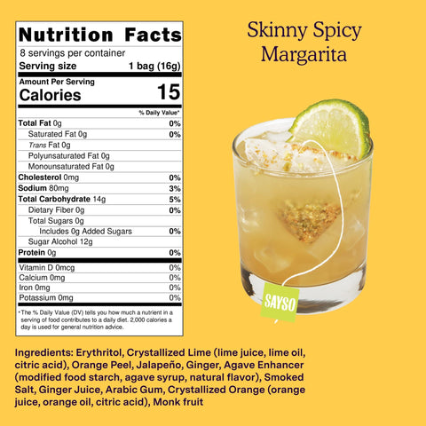 - Tantalize Your Guests with a Tongue Tingling Margarita - Each skinny spicy margarita tea bag is expertly crafted and perfectly proportioned. All-natural lime, orange peel, jalapeno, and alderwood smoked salt. SAYSO’s margarita mix delivers the perfect amount of zing, kick and sweetness.