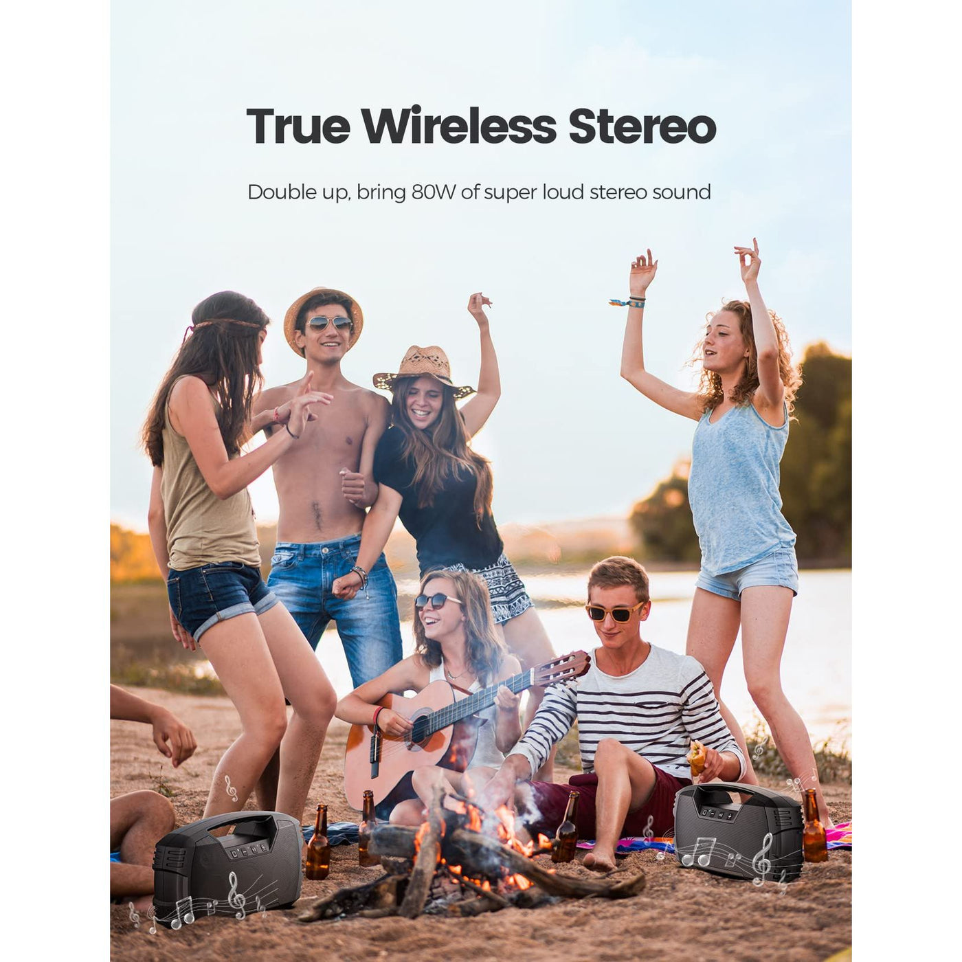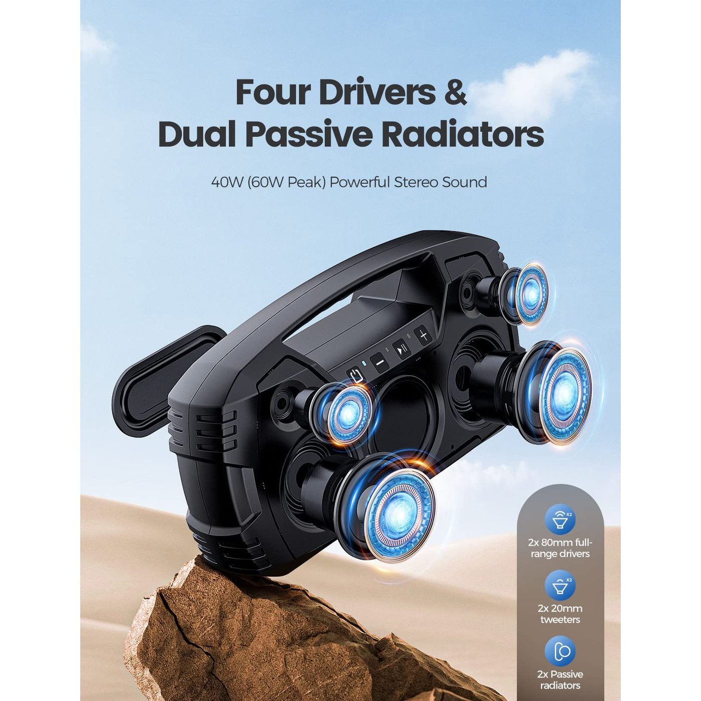 - Powerful Stereo Speaker - Featuring 4 dedicated drivers with 2 15W full-range drivers and 2 5W tweeters, along with 2 passive radiators on the front and rear, this loud Bluetooth speaker delivers 40W surround sound (peak 60W) and pumps out well-balanced midrange, crisp treble, and punchy bass with virtually no distortion, letting you enjoy the music to the utmost. Pair 2 speakers together for 80 watt stereo sound