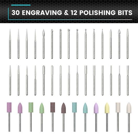 - COMPLETE KIT WITH 42 ACCESSORIES- This electric engraving pen arrives fully equipped with 42 attachments and accessories, catering to a myriad of light-duty crafting tasks. From grinding, polishing, shaping, sanding, wood carving, to engraving – all your creative endeavors are within reach with this convenient all-in-one solution. Includes 30 engraving bits and 12 polishing bits to fulfill all your project requirements.