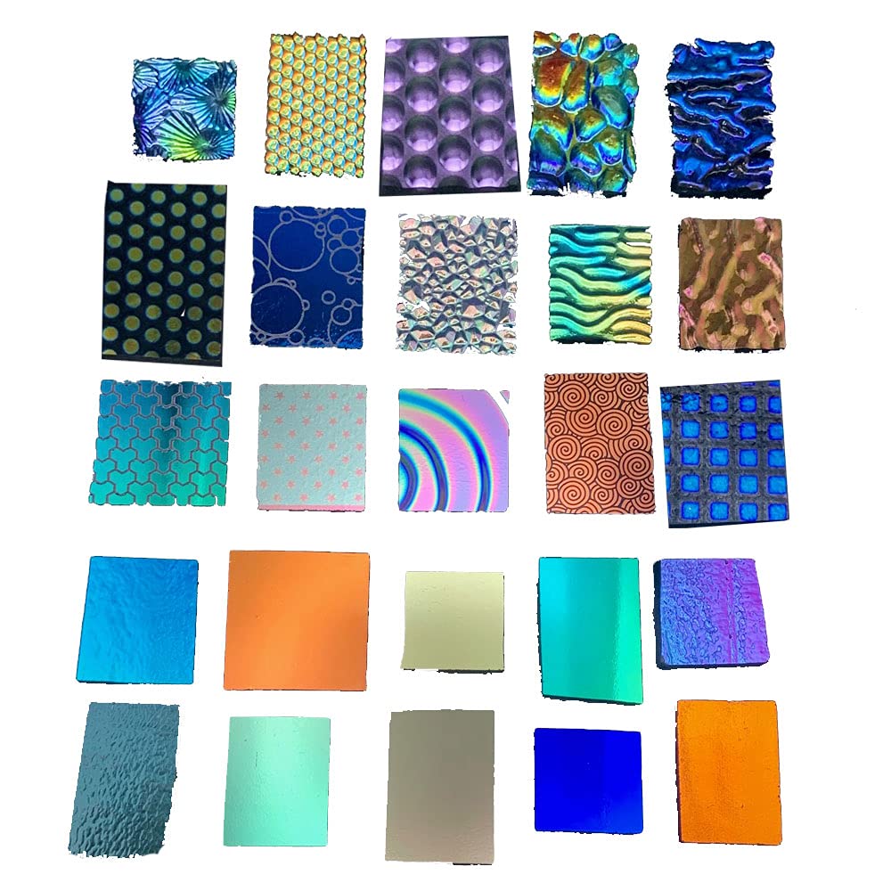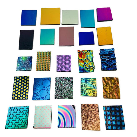 Details: This Item contains four Oz. Assorted colors, sizes, shapes, and textures of first quality COE 96 Black and Clear backed Dichroic Glass.