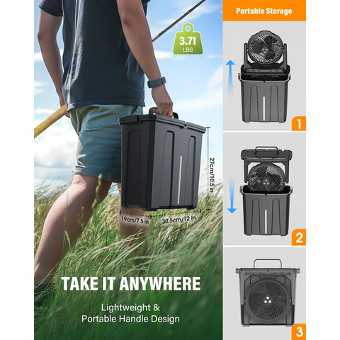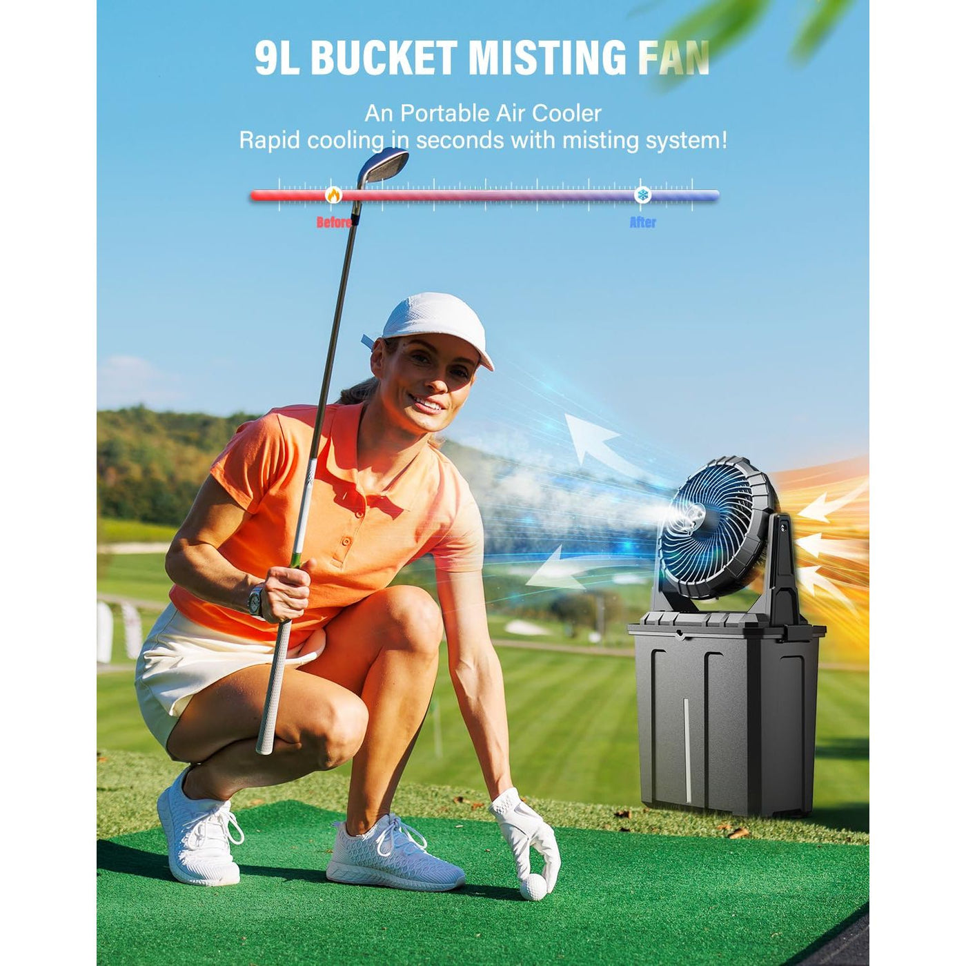 - 🌊【9L(2.4 GAL) PORTABLE BUCKET】The outdoor misting fan comes with a 9L(2.4 Gal) water bucket, so you don’t need to spend extra money to configure a water tank and it can be used as soon as you get it. The large-capacity design allows you to use it for 5-9 hours after filling it with water, no need to add water frequently every few minutes! When not in use, the misting fans for outside can be turned over and stored in the bucket, making it easy to store and convenient to carry directly when traveling outdoors.
