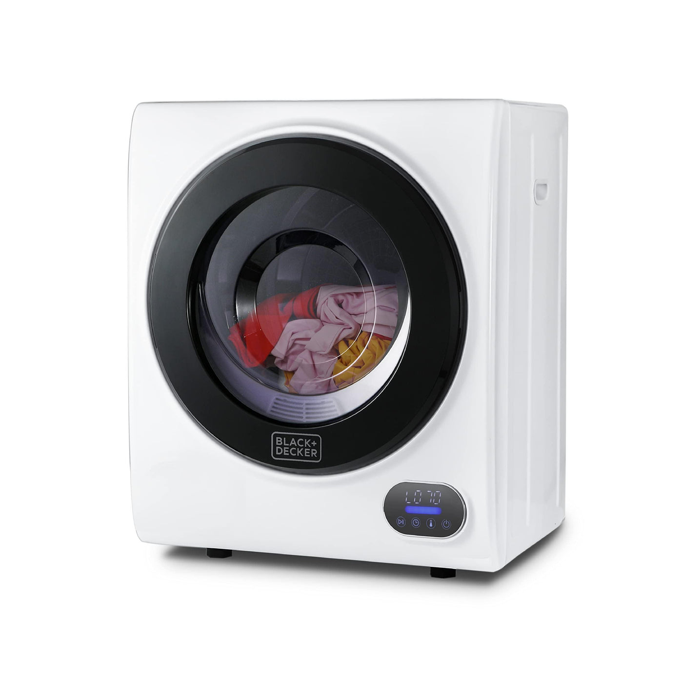 Details: This BLACK+DECKER 1.5 cu. ft. clothes dryer is perfect for smaller spaces and those who want to dry their laundry with a small and compact unit. When it comes to apartment must haves and high-quality clothes dryers, you will want this for your home! Install our 120V dryer on a flat surface and connect the 3-prong grounding plug to a conventional outlet. With this 850W apartment dryer, you can do up to 5.5 lbs. of laundry per cycle. Choose between programs to find the perfect fit for your laundry: High Temperature Drying, Air Dry, Anti-Wrinkle, and Sensor Dry—which measures moisture and automatically adjusts the heat for a more efficient drying performance. With unit dimensions of 19.5 inch x 16.1 inch x 23.8 inch and a weight of 37.5 lbs., place our small dryer where it's convenient. Enjoy a legible and electric control panel with a stainless-steel interior drum with front loading. Program the timer anywhere from 20 to 200 minutes a start/pause button for optimal convenience. Only fill the dryer halfway for fluff and drying ability. Ideal for apartments and smaller spaces. This portable dryer machine features overheat protection and a double layer lint filter. Compatible with B+D washers BPWM09W, BPWM16W, BPWM20W and BPW30MW. 60Hz, 12 amps. Enjoy freshly laundered and dried clothing with our quality electric dryers for clothes from BLACK+DECKER. This electric clothes dryer requires a 4” ventilation duct and kit that is not included. 120V.