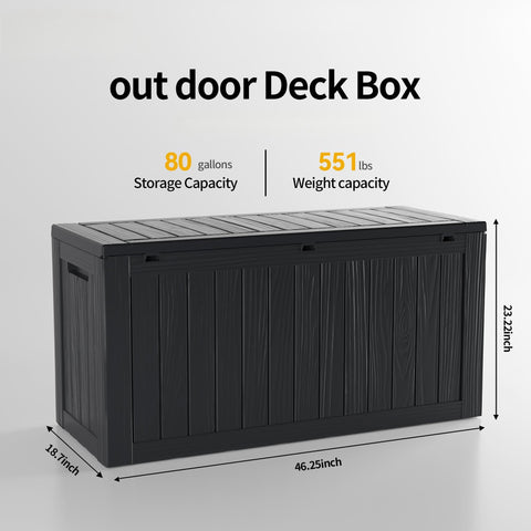 - Our deck box offers an impressive storage capacity, perfect for organizing patio cushions, pool accessories, gardening tools and more. This multipurpose storage solution not only helps keep your outdoor space tidy but also functions as a bench or table. Whether in your backyard or on the patio, this deck box is designed to meet your every need.