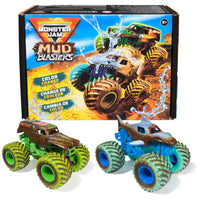 - 2 ICONIC MONSTER JAM TRUCKS: This Monster Jam Mud Blasters 2-Pack includes a 1:64 Grave Digger and Megalodon Monster Jam truck Collect them both at the same time