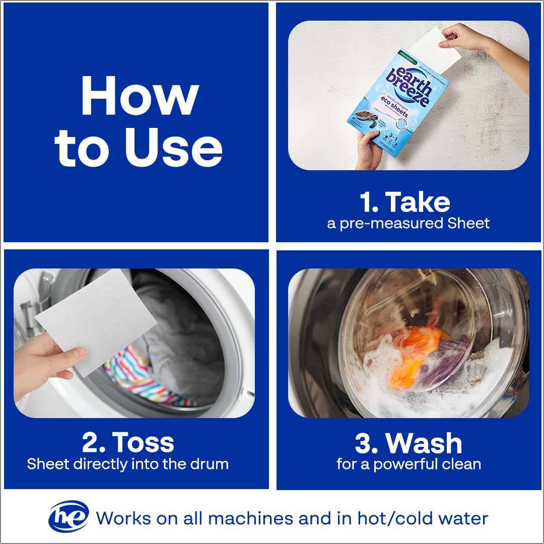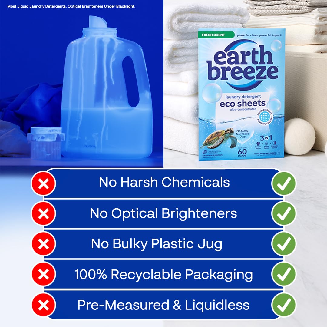 - EARTH BREEZE LAUNDRY DETERGENT SHEETS: Gentle yet powerful, these laundry sheets are hypoallergenic and free from harsh chemicals like optical brighteners, artificial dyes, parabens, phthalates, or preservatives. For every order, Earth Breeze donates laundry detergent to shelters and disaster relief organizations, with over 300 million loads donated and counting.