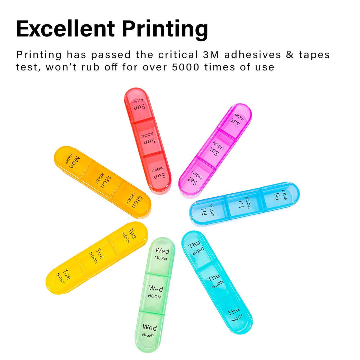 - Excellent Printing Pill Holder - Bold letter marks on the daily pill box organizer will remind you what to take by the day. The printing of the pill organizer weekly has passed the critical 3M adhesives & tapes test, and won't rub off after over 5000 times of use