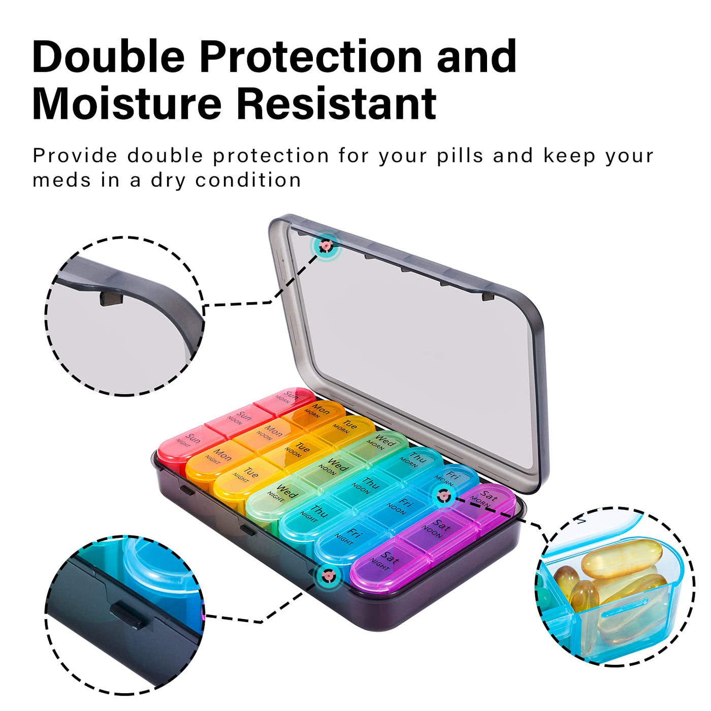 - Double Protection Design - Premium solid ABS outer container and high-quality weekly pill organizer provide double protection for your pills. Don't need to worry about pills spilling in your bag or suitcase anymore, pill organizer 3 times a day closes tightly all the time