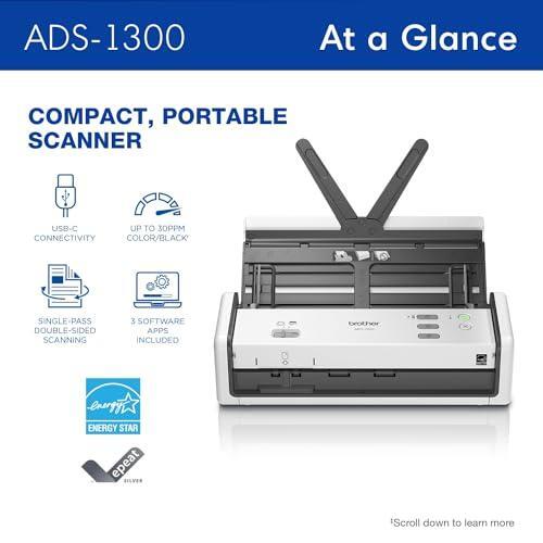Brother ADS-1300 Compact Desktop Scanner | Scan Speeds of Up to 30ppm | Single Pass Double-Sided Scanning
