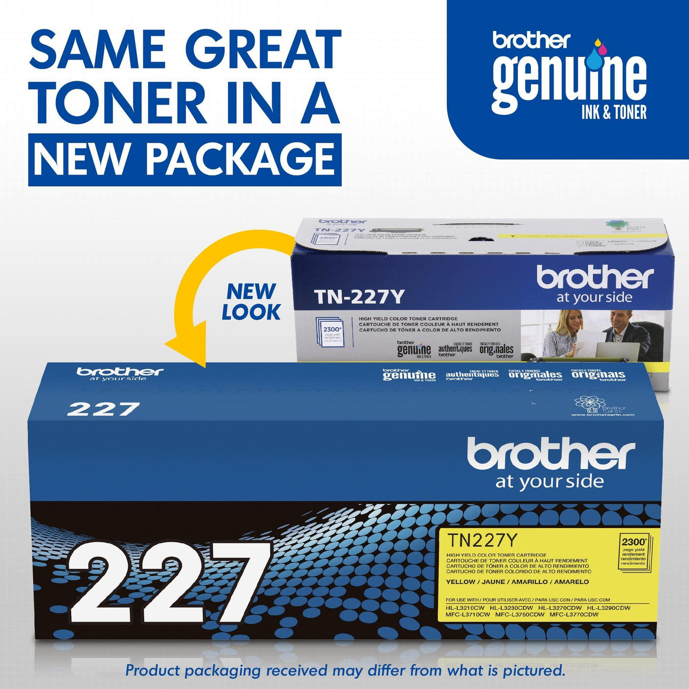 Details: Brother Genuine TN-227Y High Yield Yellow Toner Cartridges deliver consistent, rich, vivid professional color laser print quality with an up to 2,300-page yield.(1) Brother Genuine toner is intelligently engineered to work seamlessly with your Brother printer to produce superior laser quality results that withstand the test of time. Use only Brother Genuine toner cartridges for reliable results. Brother offers an environmentally responsible way for customers to dispose of Brother Genuine cartridges at end of life. Visit manufacturer’s website for more information. Brother Genuine TN227Y High Yield Yellow Toner is for use with Brother printer and all-in-one models: HLL3210CW, HLL3230CDW, HLL3270CDW, HLL3290CDW, MFCL3710CW, MFCL3750CDW and MFCL3770CDW to easily and affordably add color printing to home or small offices. Brother printers offer free online, call, or live chat support for the life of the printer.(1)Approximate cartridge yield in accordance with ISO/IEC 19798 (letter/A4).(2)Approximate 18,000-page yield each drum unit (may vary by type of use).Upon activation, Amazon Dash Replenishment eligible Brother printers will seamlessly order Brother Genuine supplies through your Amazon account and ship them directly to your door.