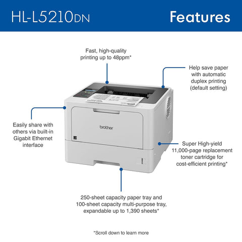 Details: The Brother HL-L5210DN business monochrome laser printer is a great choice for busy offices and small workgroups that need cost-efficient printing, versatile paper handling, advanced security features, and reliable, high-quality output. This high-performance printer helps to increase productivity with a fast print speed of up to 48ppm(1). Delivers cost-efficient printing by using the Brother Genuine TN920XXL super high-yield 11,000-page replacement toner cartridge. Includes a Brother Genuine 3,000-page toner cartridge( 2). 250-sheet capacity paper tray is adjustable for letter or legal-sized paper and the 100-sheet capacity multipurpose tray is ideal for printing on custom media or envelopes(3). Total capacity is expandable up to 1,390 sheets with optional trays(4).Triple Layer Security features help to limit document and device access and protect against network intrusions. Easily share with multiple users on your network via a Gigabit Ethernet interface and print with ease from a wide range of mobile devices to help meet mobile workforce demands(5). ENERGY STAR® certified and EPEAT® Silver rated. Help save paper with default duplex printing. Eco Mode helps to reduce power consumption, while Toner Save Mode helps to reduce toner use. One-year limited warranty with free online, live chat, or phone support for the life of your product. 1 Based on one-sided printing. Change from default setting required. 2 Approximate toner cartridge yield in accordance with ISO/IEC 19752 (letter/A4). 3 Maximum capacity based on using 20 lb. paper. 4 Requires additional purchase.5 Additional download required. Compatibility may vary by device or operating system. Wireless connection may be required.