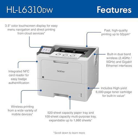 Brother HL-L6310DW Enterprise Monochrome Laser Printer with Low-Cost Printing, WirelessNetworking, and Large Paper Capacity, Works with Alexa