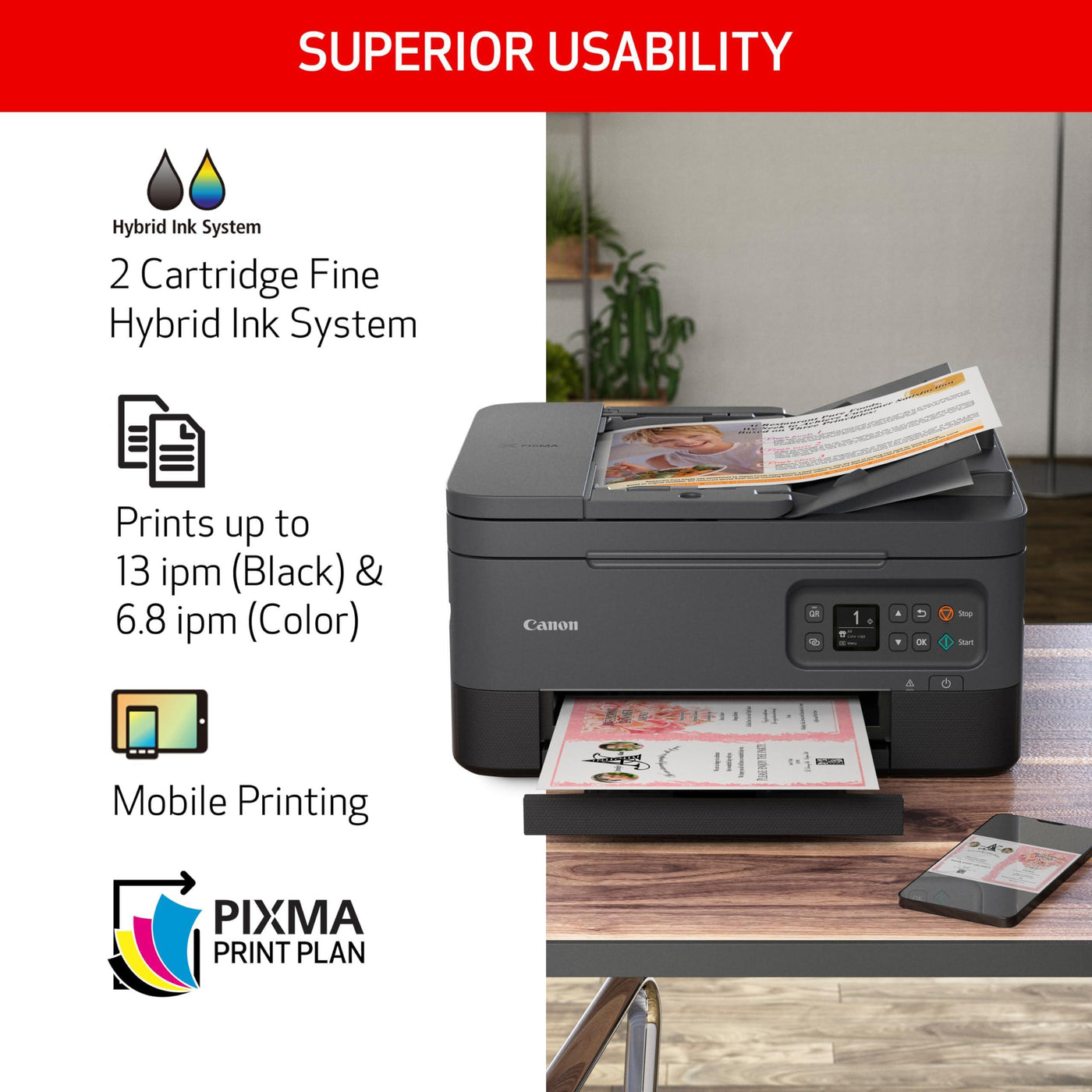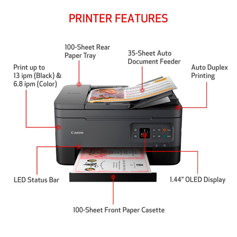 Details: Use this TR7020A Wireless All-In-One Printer to meet your home and work needs when printing, copying or scanning. Printer handles a variety of tasks from scanning signed contracts with the auto document feeder to printing from your smartphone. It's easy to set up, simple to use and feature-rich - with a 1.44" OLED display, front/rear paper reader and auto-duplex printing. Front/rear paper feed holds plain paper in the front cassette, and rear tray extends to print on photo paper or other paper types. Enjoy sharp, black text for documents and great-looking photos thanks to the hybrid ink system. It prints a 4" x 6" photo in approximately 43 seconds and generates 6.8 ipm (color). When copying, it makes up to 99 copies in 6 ipm (color). The 35-sheet ADF copies and scans multiple documents with ease. Printer's resolution is up to 4800 x 1200 dpi. Standard interface uses Hi-speed USB, wireless PictBridge, Wi-Fi and Bluetooth 4.0 LE. Paper Capacity: Rear Paper Tray: 100 Sheets of Plain Paper OR 20 Sheets of 4 x 6 / 10 Sheets of 5 x 7 Photo Paper Front Paper Cassette: 100 Sheets of Plain Paper
