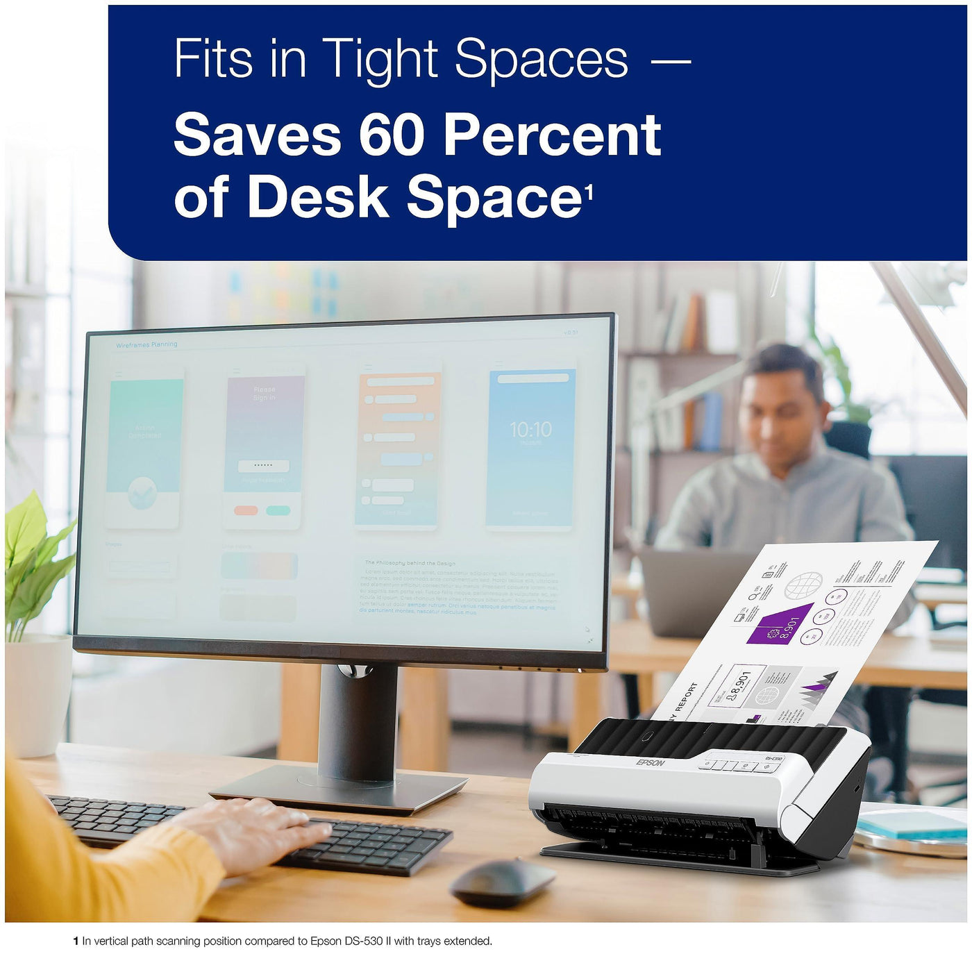 - Fits in tight spaces — compact, vertical design saves 60 percent of desk space (1) with the same powerful performance as comparable commercial desktop document scanners