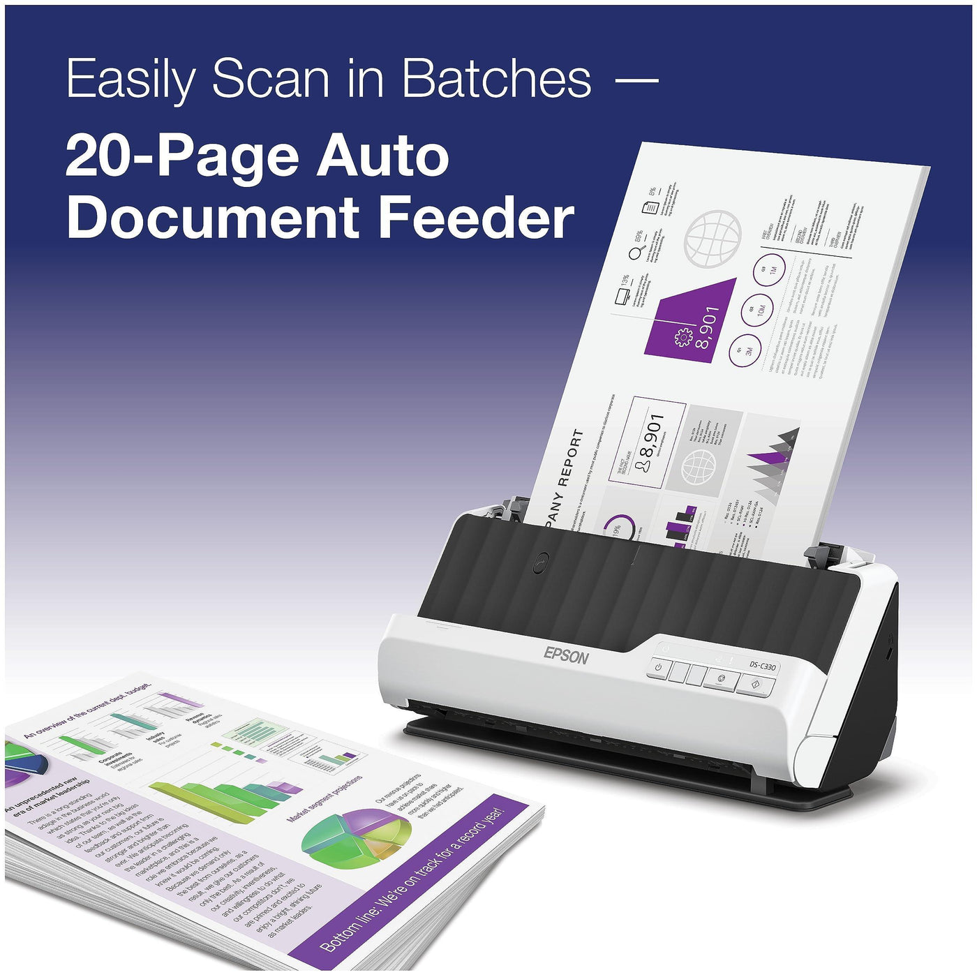 - Easily scan in batches — compact 20-page Auto Document Feeder accommodates stacks of documents of varying sizes
