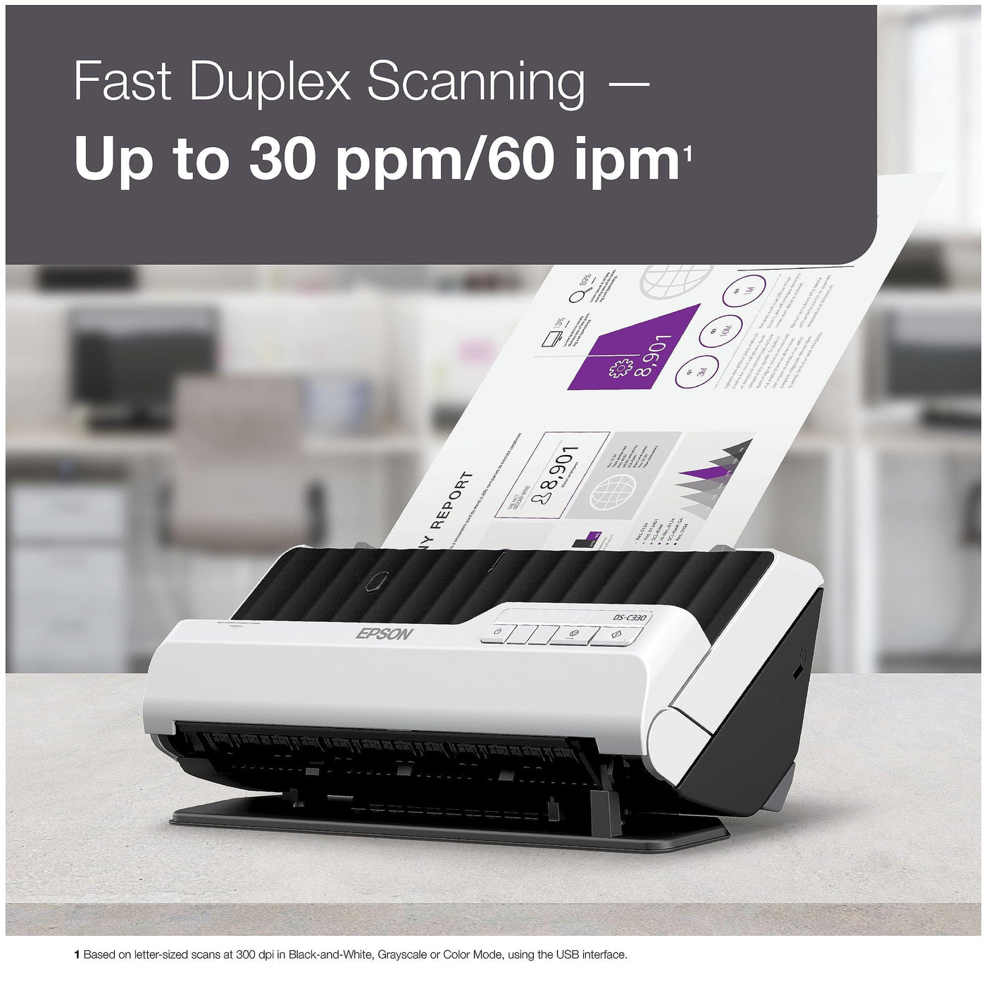 Details: Get the most out of your workspace and keep your workflow moving with the compact DS-C330. This remarkably small and lightweight scanner features a vertical paper feed system and saves up to 60 percent of desk space (1), so you can stay productive even when space is limited. Designed to deliver a powerful performance even in tight spaces, the versatile DS-C330 accommodates cards, passports (2) and other document types and quickly scans 2-sided documents at speeds up to 30 ppm/60 ipm (3). In addition, a 20-page Auto Document Feeder (ADF) makes it easy to scan in batches. The DS-C330 scans papers of varying sizes up to 8.5" x 120" (4), and intelligent image adjustments (5) such as automatic cropping and dirt detection allow for incredible image quality. Engineered for the rigors of a commercial environment, the DS-C330 comes with powerful Epson Document Capture Pro software (6) and includes TWAIN and ISIS drivers for seamless integration with most document management systems.