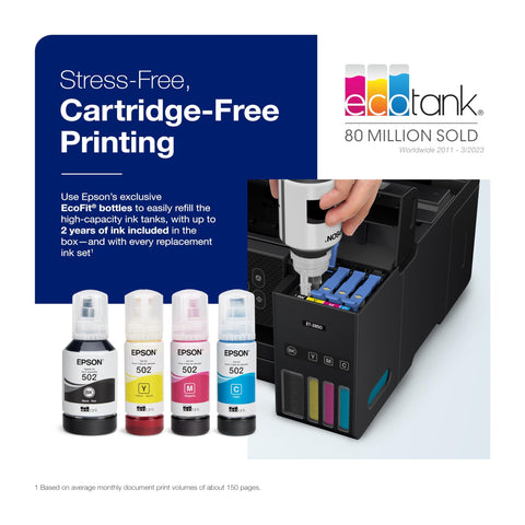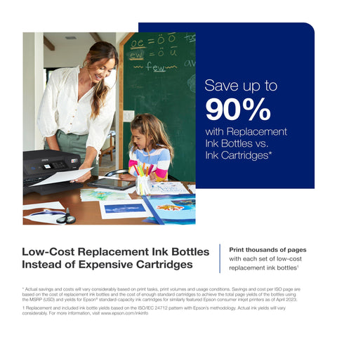 Epson strongly recommends the use of genuine ink to ensure optimal print quality and performance. Use of non-genuine ink could cause damage not covered under the printer’s ltd. wnty. | 1. Actual savings and costs will vary considerably based on print tasks, print volumes and usage conditions. Savings and cost per ISO page are based on the cost of replacement ink bottles and the cost of enough standard cartridges to achieve the total page yields of the bottles using the MSRP (USD) and yields for Epson standard-capacity ink cartridges for similarly featured Epson consumer inkjet printers as of March 2024. | 2. Individual cartridges estimate based on print yields of an included or replacement set of black and color ink bottles as compared to Epson standard-capacity ink cartridges for similarly featured printers as of March 2024. | 3. Part of the ink from the included bottles is used for initial setup; yields are lower than those of replacement ink bottles. Replacement and included ink bottle yields based on the ISO/IEC 24712 pattern with Epson’s methodology. Actual ink yields will vary considerably for reasons including images printed, print settings, temperature and humidity. Yields may be lower when printing infrequently or predominantly with one ink color. All ink colors are used for printing and printer maintenance, and all colors must be available for printing. For more information, visit www.epson.com/inkinfo | 4. Based on average monthly document print volumes of about 150 pages. | 5. See www.epson.com/voice for device compatibility. Epson Connect account and voice-activated account registration required. | 6. Most features require an Internet connection to the printer, as well as an Internet- and/or email-enabled device. For a list of Epson Connect enabled printers and compatible devices and apps, visit www.epson.com/connect | 7. Requires Epson Smart Panel app download. Data usage fees may apply.