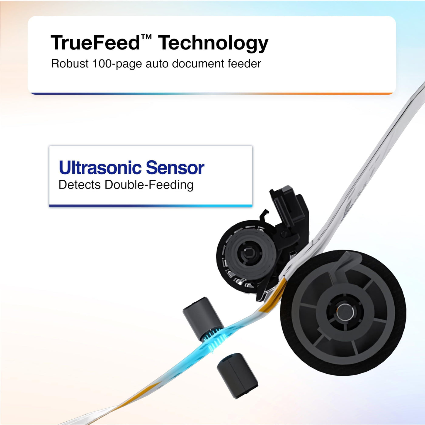 - TrueFeed Technology — Robust 100-page document feeder with paper skew and staple protection easily feeds stacks of various sized documents