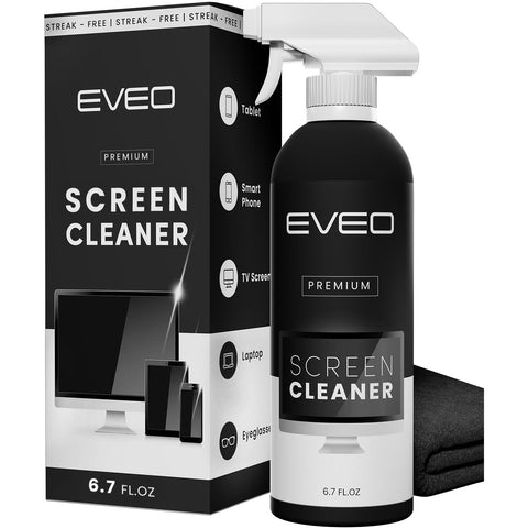 - Easy-to-Use Screen Cleaner Kit + microfiber cleaning cloth- The EVEO Screen Cleaning Kit will easily be your new favorite tool when it comes to taking care of the things you love most, quick and easy solution for a streak-free screen. Simply screw on the sprayer gun on the screen cleaner bottle. Spray the cleaning liquid onto the microfiber cloth, then wipe the screen until desired cleanliness & shine is achieved.