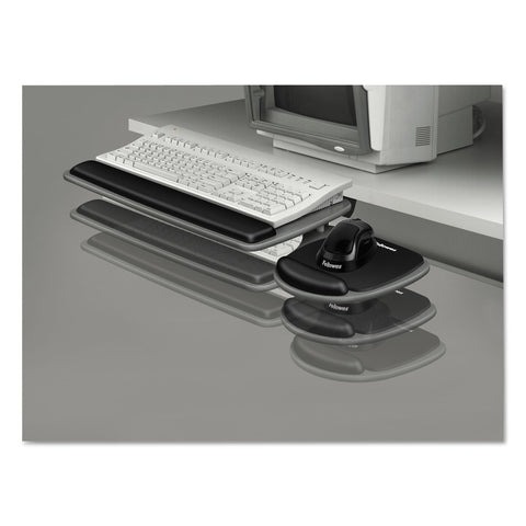 - Mouse tray mounts on either side of keyboard tray or stows underneath