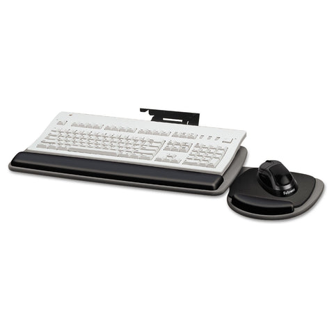Details: Single knob offers quick and easy adjustment of height and tilt. Platform swivels to preferred position. Keyboard and mouse gel wrist rests for comfort. Fits virtually every keyboard including the Microsoft Natural. Workstation Type--Diagonal, curved or straight Glide Track Length--17-5/16" Keyboard Tray Dimensions--20-1/4 wide x 11 long.