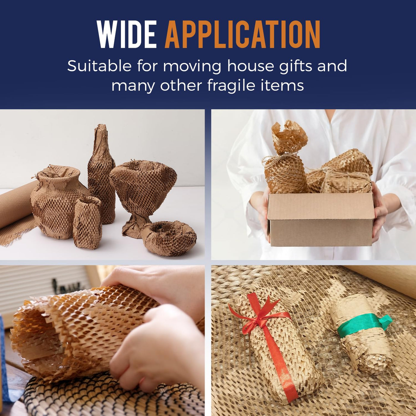 - Certified FSC C204227 Eco Friendly Shipping Supplies: Say goodbye to large bubble wrap roll! Our honeycomb wrapping paper for moving essentials offers an eco-conscious alternative. Crafted from 100% recyclable packing materials. This gentle packing paper sheets for moving comes with Jute Rope and keeps your items safe in transit