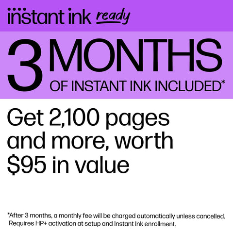 - 3 MONTHS OF INK INCLUDED when you activate HP+ – Subscribe to Instant Ink delivery service to get ink delivered directly to your door before you run out. After 3 months, monthly fee applies unless cancelled