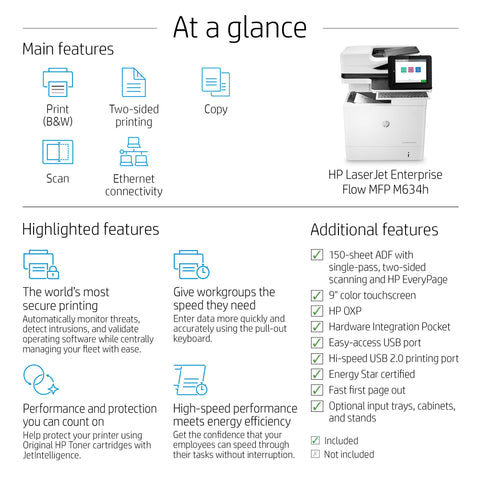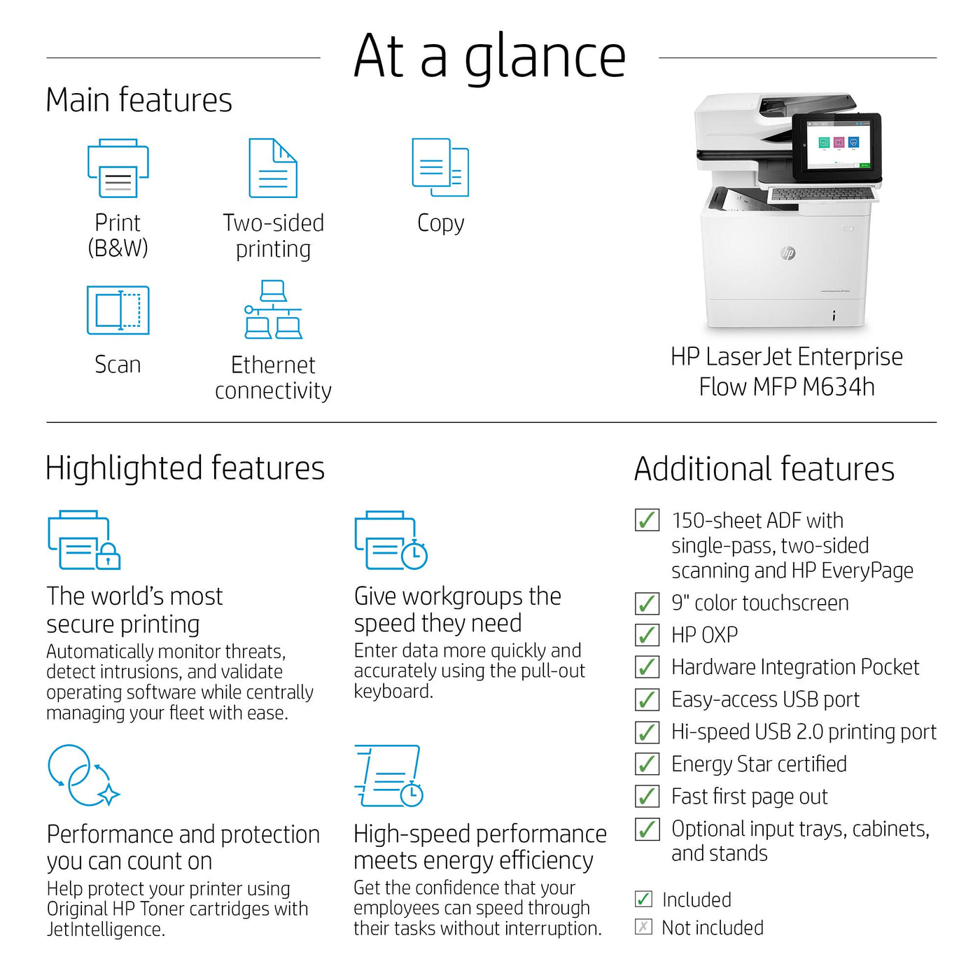 - World's most secure printing: Print, scan, and copy professional-quality 2-sided documents with the HP LaserJet Enterprise MFP M634hFlow, a multifunction laser printer with JetIntelligence designed to combine performance, energy efficiency, and security