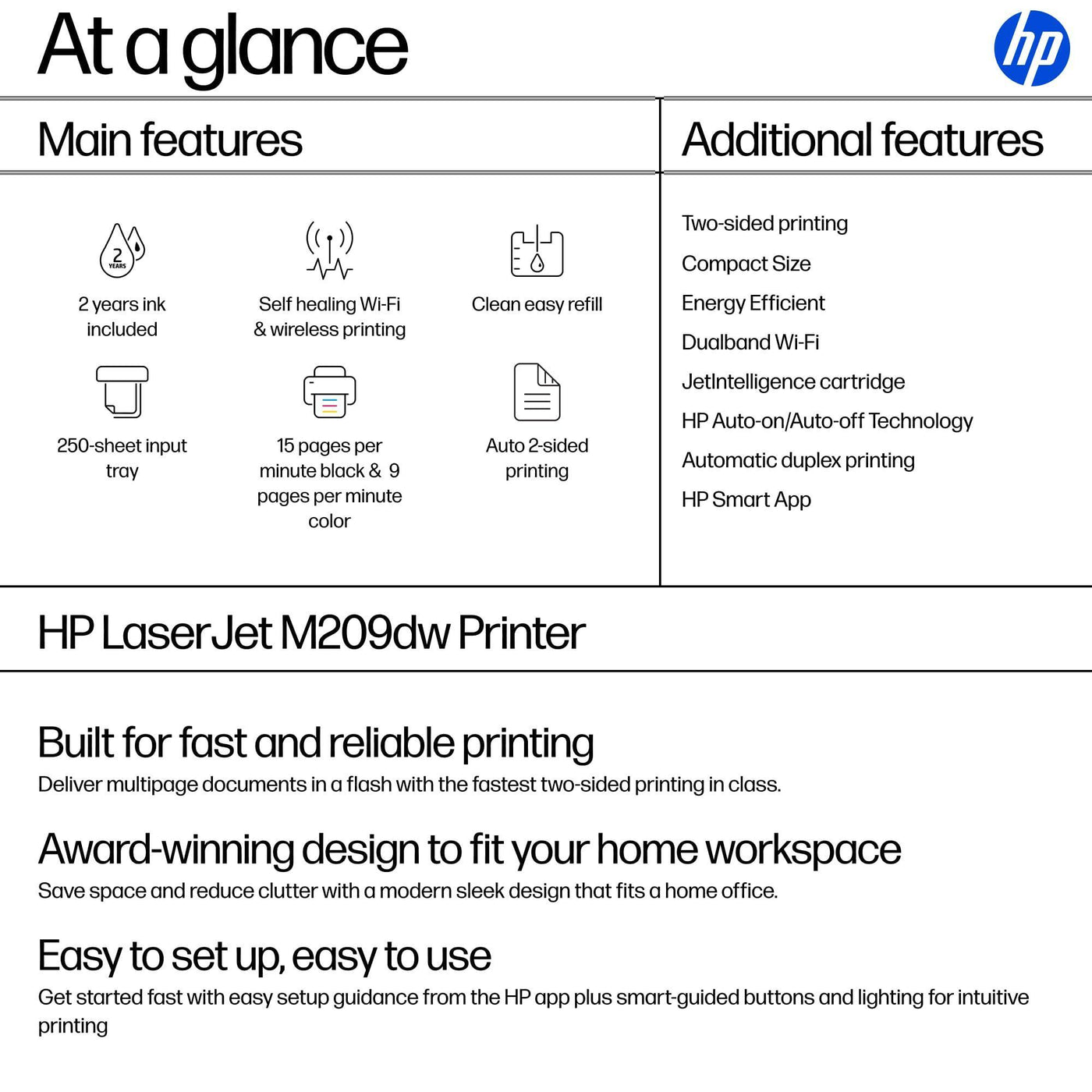 Details: The HP LaserJet M209dw offers fastest in-class two-sided laser printing, plus smart setup and reliable connectivity. Get peace of mind from more reliable connections with dual-band Wi-Fi with self-reset and strong security. And work more efficiently with timesaving features in the HP Smart app.