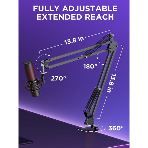 - Free Position Mic Arm: This professional microphone stand is fully adjustable in all parts with 360° base rotation for 135° back and forth extension, 180° arm shaft for up-and-down movement, and 270° metal adapter to freely position microphones. It can be easily folded and pushed away for space-saving storage when it stands idle and pull it back for usage.