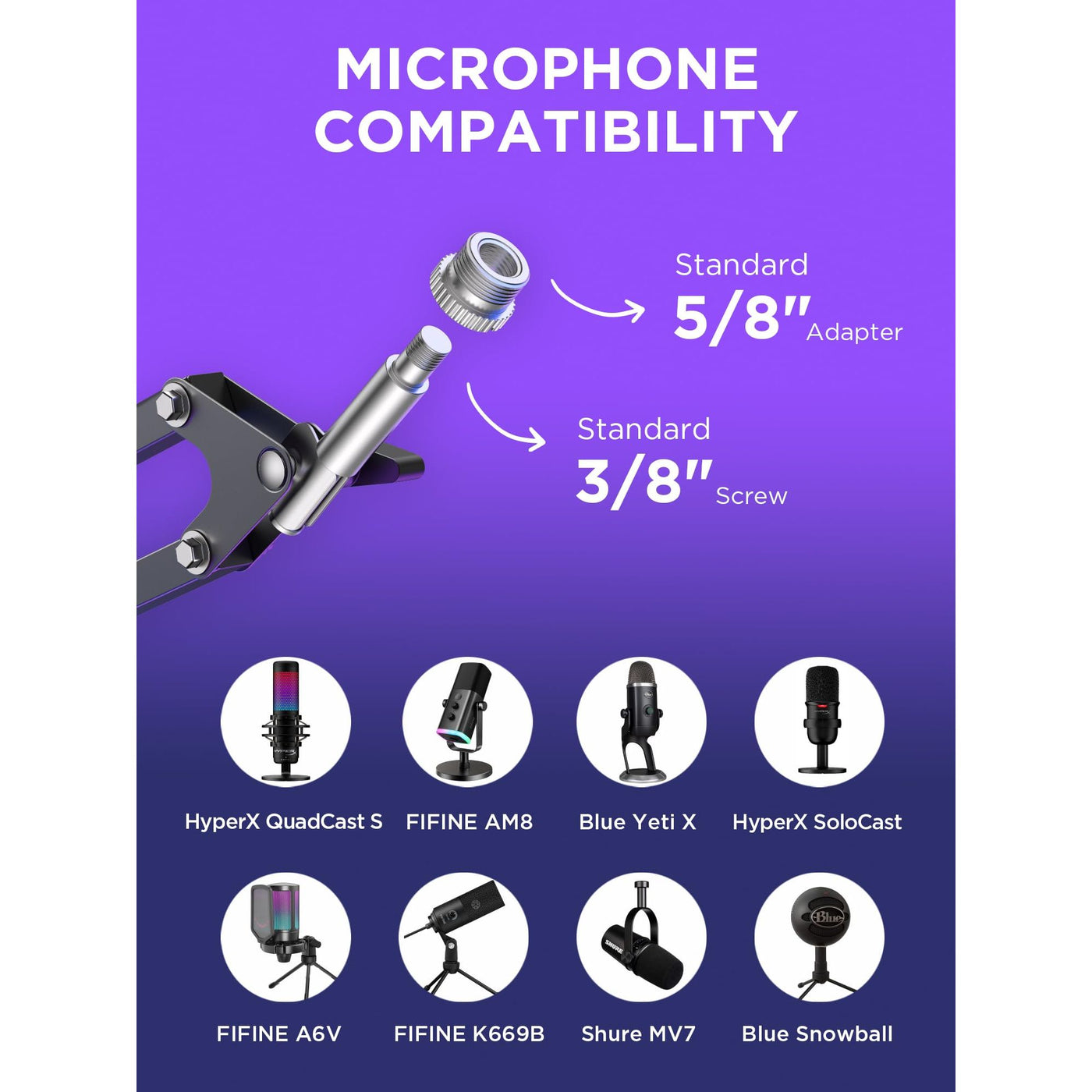 - Microphone Compatibility: This microphone arm stand allows diversity and compatibility, for it comes with a standard microphone clip to fit for dynamic microphones like Shure SM58, Samson Q2U, Shure PGA48 and more, and a 5/8" to 3/8" adapter for Blue Yeti, Blue Snowball, Blue Snowball iCE, Hyper X QuadCast, SoloCast, Shure SM7B, MV7, Fifine AmpliGame, Fifine K669B (Shock mount not included), Fifine AM8, etc.